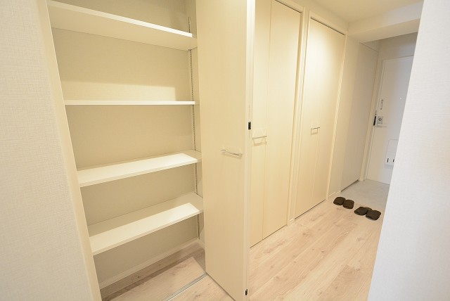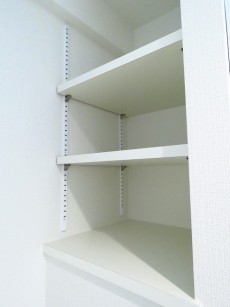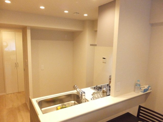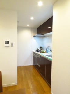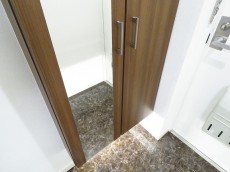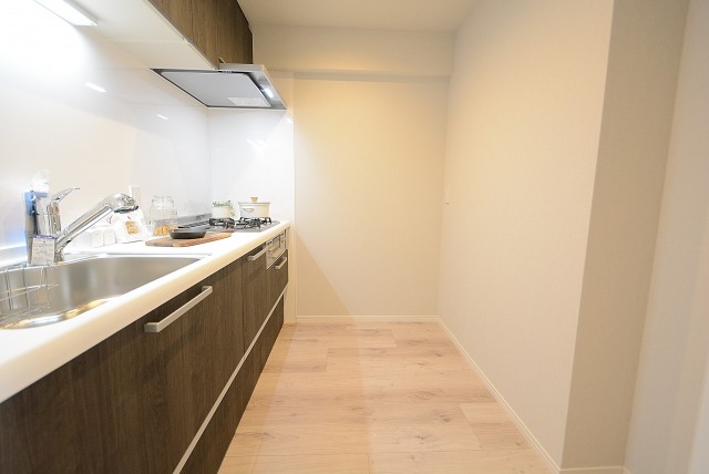 キッチンは独立しており、LDK側から調理スペースは見えづらくなっています。 キッチン近くにはスリムな縦長の物入れもありました。