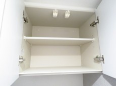トイレはウォシュレット付き。トイレ内にも収納棚が設置されていました。