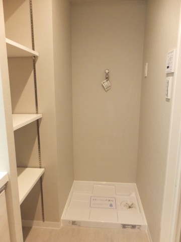 洗面化粧台と洗濯機の間には、大きい収納棚があります!
