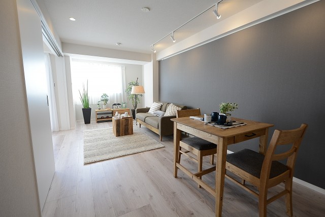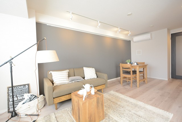 LDKは約12.1帖。家具が置いてあるので実際の生活イメージもつきやすいのではないでしょうか?LDK内に窓はありませんが、エアコンが設置されています。引っ越したその日から快適な生活が送れます。