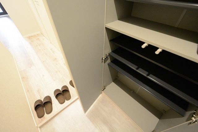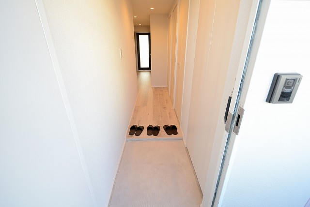 白を基調とした木目調のフローリングと鏡面仕上げのシューズクロークがお出迎えをしてくれます!