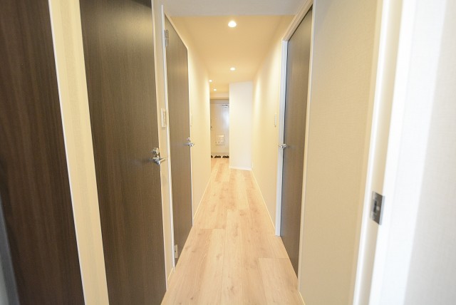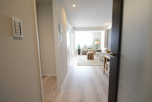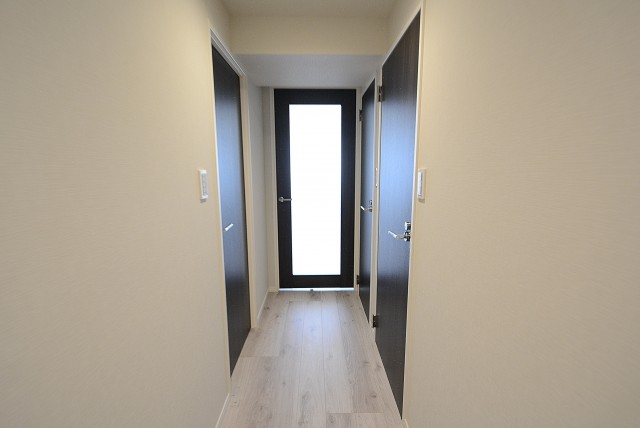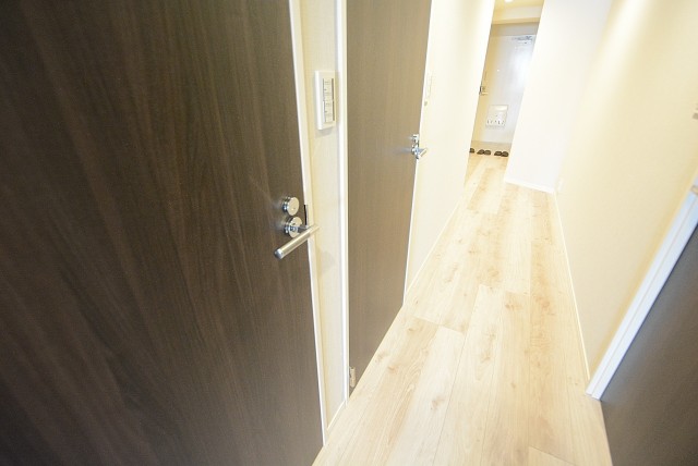 玄関をあがると目の前は廊下。左側の扉が洋室、正面の扉がLDKです。