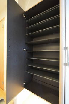 玄関を入ると右側にトールタイプのシューズBOXがあり可動棚で高さ調節可能。
