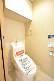 トイレットペーパーなどのストックに重宝する吊戸棚も設置済み。