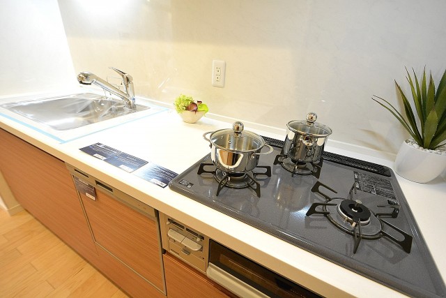 キッチン設備は3口ガスコンロにグリル、浄水器一体型水栓に食洗器も付いて充実しています。