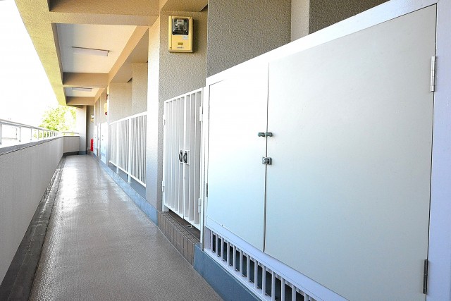 共用廊下にはトランクルームもあり、ベビーカーなどをしまっておくスペースなどに重宝します。
