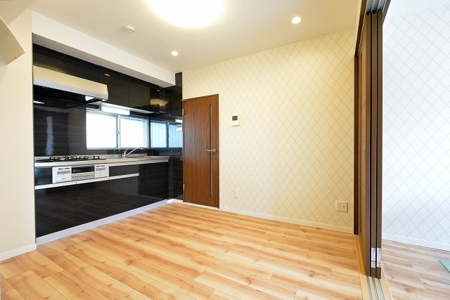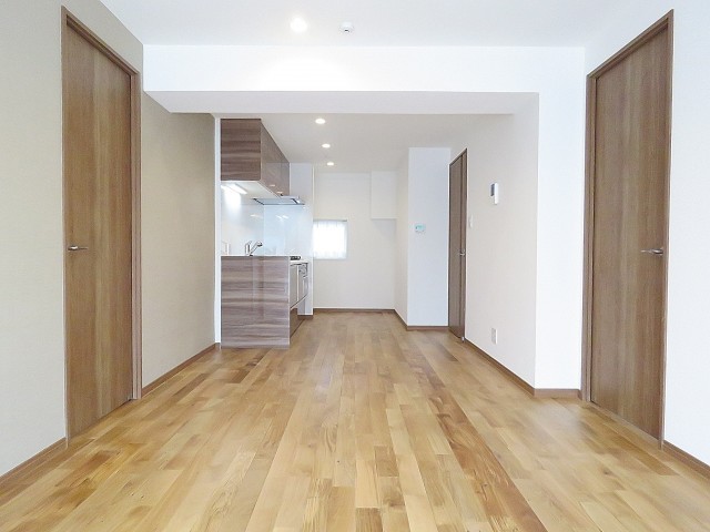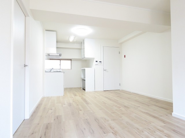 建具、キッチン、壁面は白、フローリングはナチュラルな色合いの木目調です。どんなテイストの家具を置いても馴染みそうですよ。