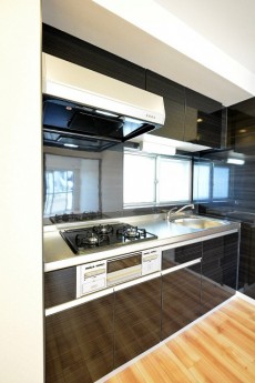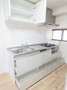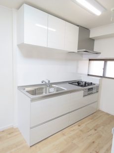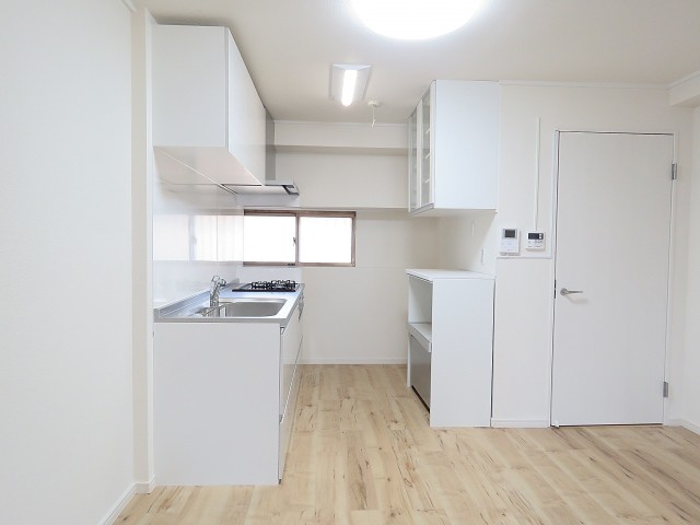キッチンは扉側にあります。横に窓があるので自然換気ができるのもいいですね。窓の外は共用廊下なのでお料理のいい匂いが廊下に広がるかも(;´∀`)
