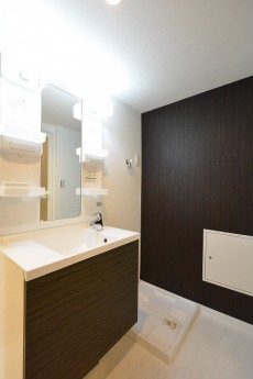 こちらは廊下を進んですぐ左側にある洗面室。玄関から近いので帰宅後の手洗い・うがいもサッと済ませられます。中は洗面化粧台、洗濯機置場、バスルームがまとまっています。