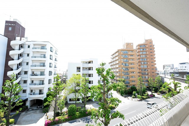 気になる眺望です。バルコニーの外は目黒通りを挟んでマンション等が立ち並ぶ風景です。車の走行音はそこそこしますが、扉を閉めてお部屋の中にいれば落ち着いて過ごせそう、という印象です。音の感じ方には個人差がございますので、気になる方は現地で実際にご確認されることをおすすめいたします。