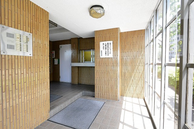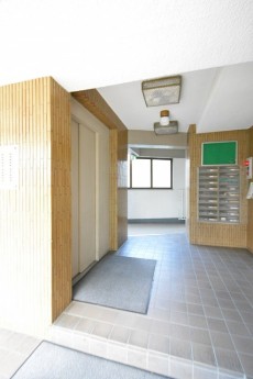 管理人室向かい側がエレベーター、奥に共用階段があります。