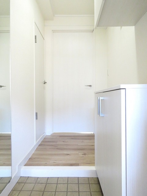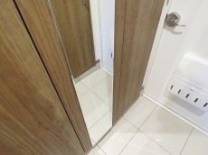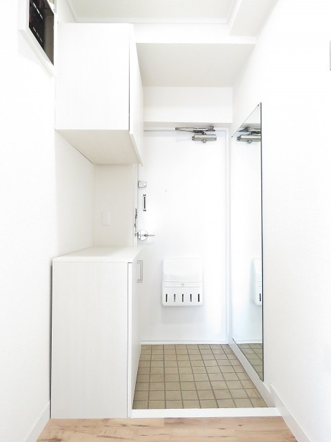 白いシューズBOX向かいには姿見が設置されているのでお出かけ前の身だしなみチェックもここでバッチリできます。