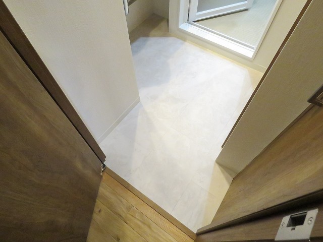 玄関をあがると廊下があり、横に洗面室、正面にリビングダイニングキッチンの扉があります。