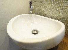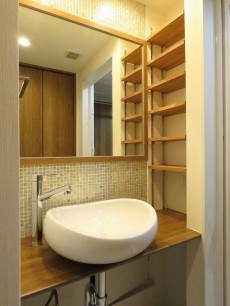 木のカウンターにまあるいフォルムの洗面ボウルがのっているのが印象的な洗面化粧台。鏡の上下のモザイクタイルもステキですね!洗面まわりで使うものは横の棚へ置けるようになっています。