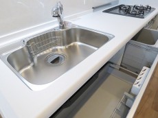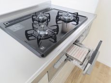 キッチンはご覧の通り、吊戸棚に引き出しと収納スペースがたっぷりあります。