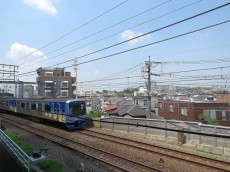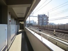 共用廊下の外は線路。電車好きな方にはうれしい景色ですが、走行音はそれなりに・・・という状況です。