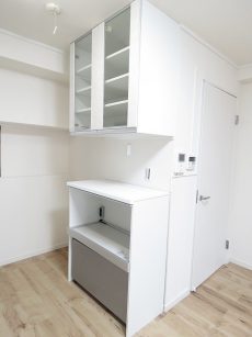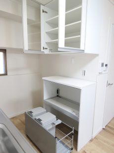 キッチン向かい側には食器やキッチン家電が置ける収納が設置されています。