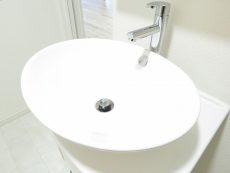 洗面化粧台はスリムながらも鏡の裏、引き出しなど収納スペースもしっかりあります。ラウンド型の洗面ボウルになんだか癒されます。