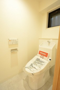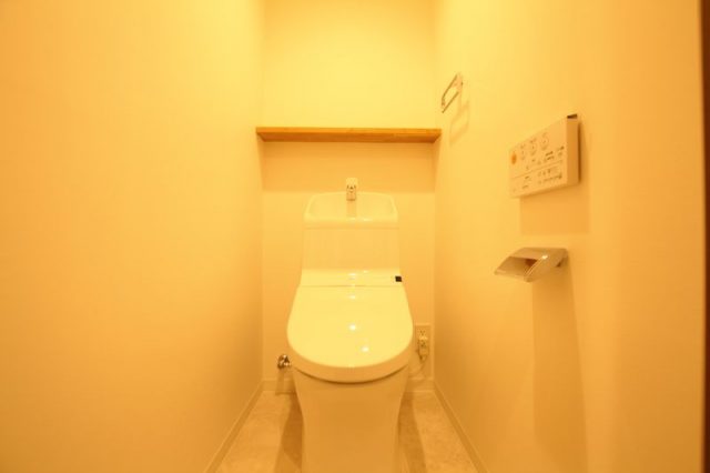 トイレはINAX製のシャワートイレ付き。トイレットペーパーなどの収納に便利な吊戸棚、いろいろ飾れるカウンターも設置されていますよ。吊戸棚の設置位置が低いのも有難いです(^^)