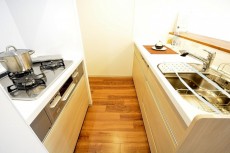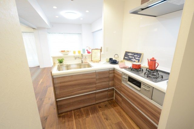 キッチンは壁付けタイプで収納が豊富で、デッドスペースがなく限られた空間を広く使うことができます。