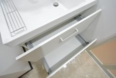 収納は洗面台下と三面鏡裏のキャビネット。細々した物が多くなりがちな洗面周りには、キャビネットはピッタリの収納です。