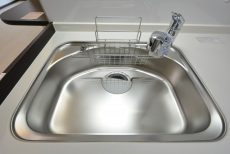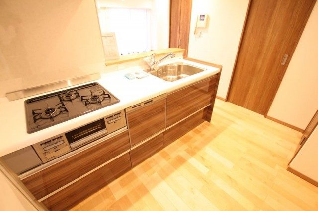 設備は3口ガスコンロにグリル、浄水器一体型水栓に食洗器も付いて充実しています。