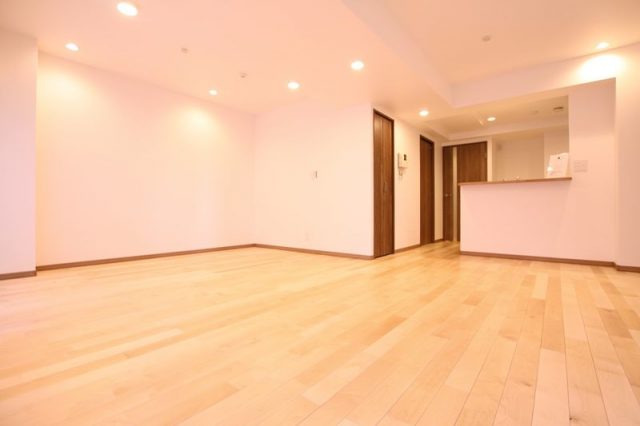 こちらはリビング・ダイニング・キッチン。手前からキッチン、ダイニング、リビングと使える、レイアウトしやすそうな縦長タイプです。白のクロスや白木の建具を使ったナチュラルテイストのお部屋は、バルコニーに面した窓からの光で明るい雰囲気になっています。