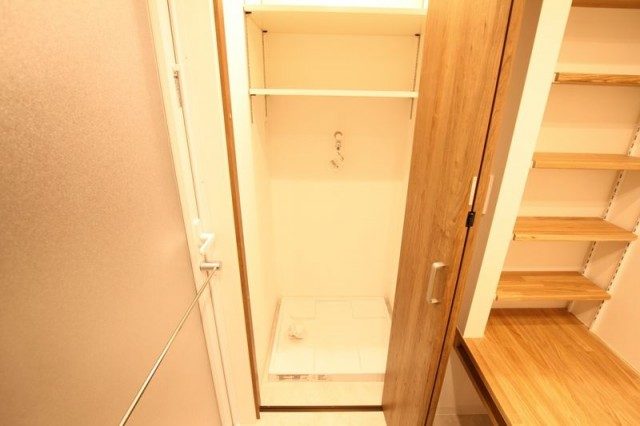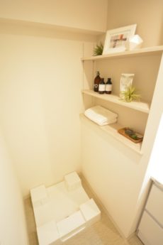 洗濯機スペースの横には棚があり、洗剤などの洗濯グッズを置いたり、リネン棚としてタオルなどを置く事のも良さそうです。