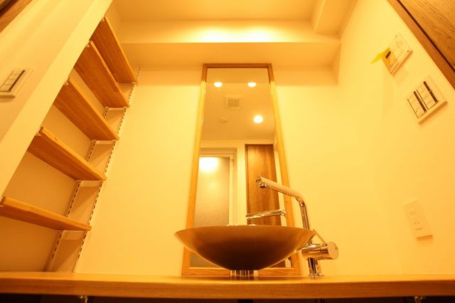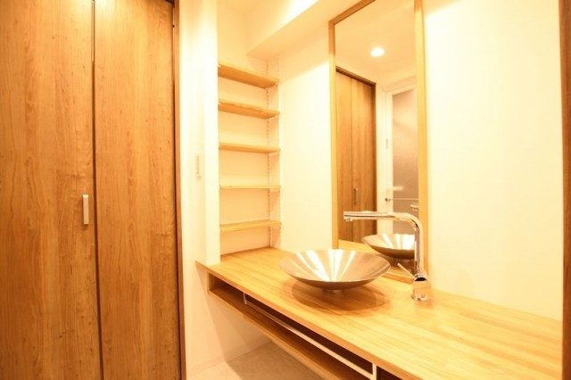 鏡の大きな洗面台はシャンプードレッサータイプで使いやすく、鏡の横にリネン庫も設置してあります。