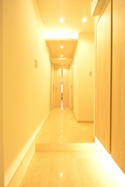 玄関から廊下にかけては大理石貼り。高級感のある空間になっています。冷たい印象になりがちな石ですが、暖色系の柔らかい色を使う事で温かみのある雰囲気になっています。