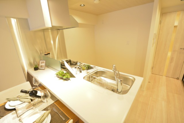 設備は3口ガスコンロにグリル、浄水器一体型水栓に食洗器も付いて充実。
