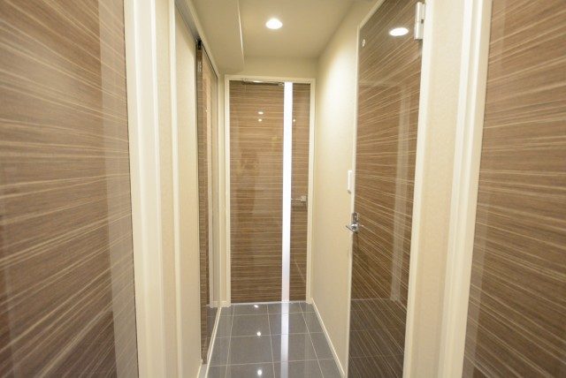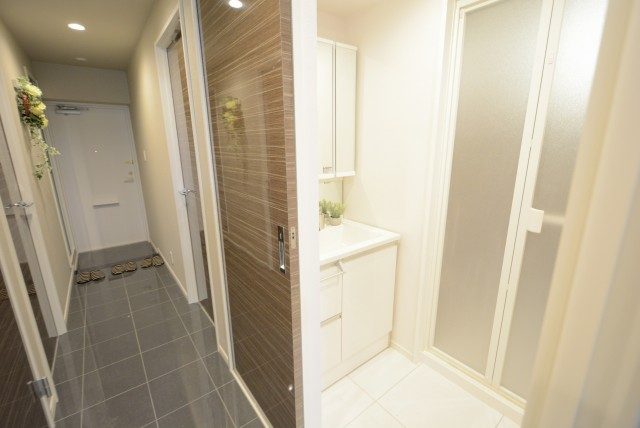 正面に洗面台があり右側にバスルーム、左側奥のランドリースペース横にはリネン庫も設置されていてバスタオルを置くスペースやシャンプーなどのストックに重宝します。