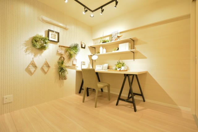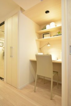 ダイニングの後ろにはデスクが造り付けられていて、ちょっとしたDENスペースになっていました。PCスペースや仕事、勉強、趣味など様々な使い方が出来ますよ。実際座ってみると周りが囲まれていて、集中出来る事請け合いです(^^)