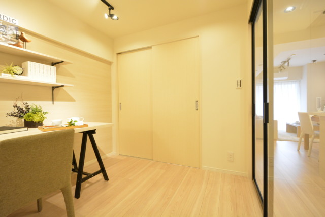 こちらは三つ並んだ、真ん中の洋室。窓はありませんがガラス張りなのでLDKから明るい光が入ってきています。今は書斎の様になっていますが、もちろんベッドルームとしても使えますよ。その際は、見晴らしのいい扉にはロールカーテンなどを付けましょう。