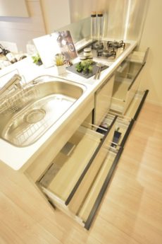 調理台下は引き出しタイプの収納と食器洗浄乾燥機。引き出しタイプは、たくさん入れても奥の方まで出し入れがしやすいのが特徴です。そして食洗機!!!これで、食後はみんなでのんびり過ごせそうですね♬