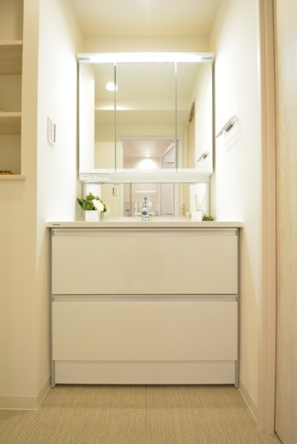 ボウルが大きく使いやすいシャンプードレッサータイプの洗面台は三面鏡の裏など機能。