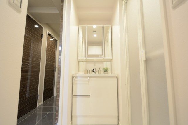 真っ白で清潔感のある洗面台は三面鏡付き。上部のライトのおかげで鏡を使う時に影になったりもしませんよ。