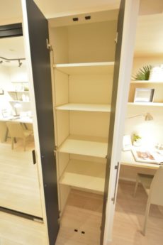 机の隣には収納棚。奥行きがあって大きな物も入る収納です。細かい物は、収納グッズを上手く使って入れましょう。