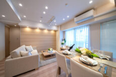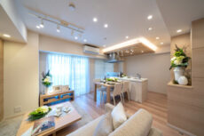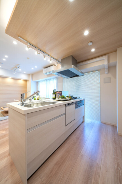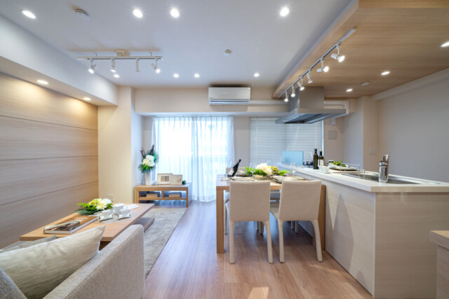 こちらは約14帖のリビング・ダイニング・キッチン。南東向きバルコニーに面したお部屋です。リビングダイニング部分は折り上げ天井になっていて、設置された間接照明が立体感を強調しより広がりを感じさせてくれます。