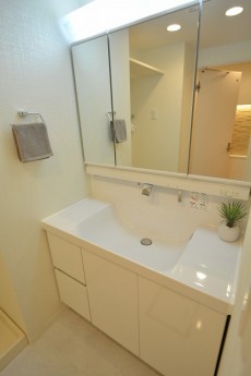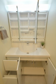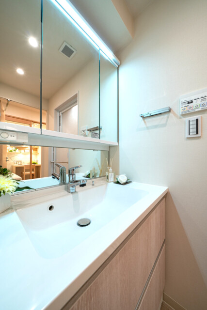 洗面室には洗面化粧台、洗濯機スペース、浴室がまとまっていて、脱衣所を兼ねています。洗面化粧台は身だしなみを整えるのに重宝する三面鏡付。洗面ボウル下のスライドキャビネットやミラーキャビネットなど、豊富な収納も嬉しいですね。