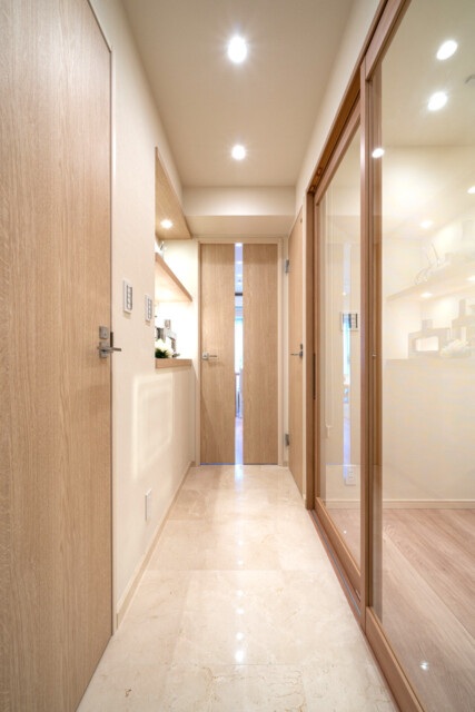玄関から廊下にかけては豪華な大理石貼り!!!建具のナチュラルな色合いに合わせたアイボリー系で温かい雰囲気になっています。廊下に設置されたニッチにお気に入りの小物などを飾れば、さらに自分好みの空間に出来ますね♬