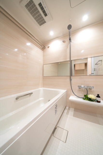 浴室は白を基調にしたストーン調パネルを使用。ゆったりと湯舟に浸かれば一日の疲れも洗い流せそうですね♬ 追い焚き機能や浴室換気乾燥機などの便利機能も完備しています。