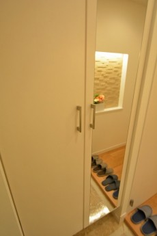 玄関左側には大きな鏡付きのシューズボックスがあります。