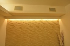 西側の壁の上部には備え付けのスピーカーも!!そして、壁は空気をきれいにしてくれる壁「エコカラット」でした♪