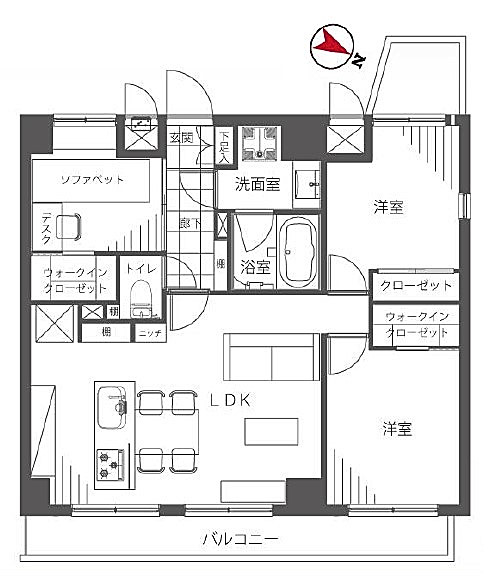 LDKと同じ北西向きのバルコニーに面しています。柱などもないきれいな形のお部屋で、家具のレイアウトもしやすそうですね。収納はウォークインクローゼット!