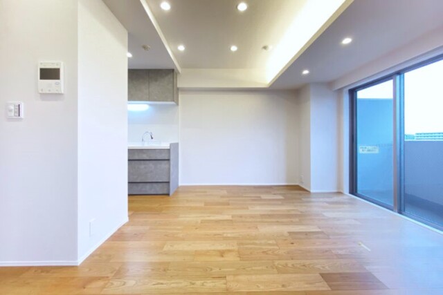 こちらは約10.3帖のリビング・ダイニング・キッチン。北向きのバルコニーに面したお部屋です。北向きって暗いイメージありますが、陽射しが直接入らないだけで意外と明るいんですよ。