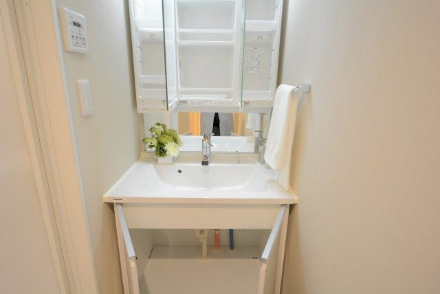 水洗の後ろまでいっぱいを使った大きな鏡で毎朝の身支度が一気にしやすくなるのでは!?