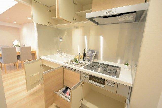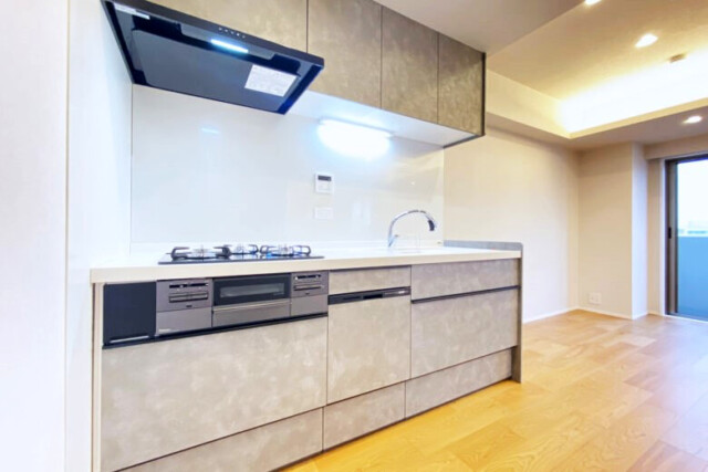 キッチンは壁付けタイプ。場所をとらずにお部屋を広く使えるのが特徴です。ただし、キッチン内が目立つのでなるべくキレイにしておきましょう。みんなの憧れ食器洗浄乾燥機付き!!!