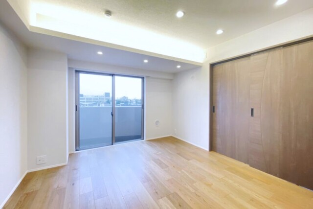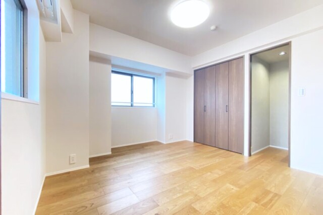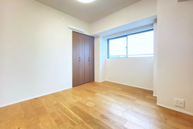 廊下に戻って…こちらは約4.9帖の洋室2。LDKを通らず出入りが可能な、独立性高めのお部屋です。窓は東向きなので朝は気持ち良く目覚められそうですね。クローゼット付き。
