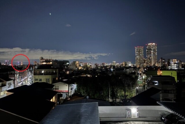 というわけで夜景です。おわかりいただけますか?赤い丸で囲んだ所に仲良く並んでいますよ。肉眼で見るともっときれいなので、是非お天気のいい日に直接ご覧になってください!